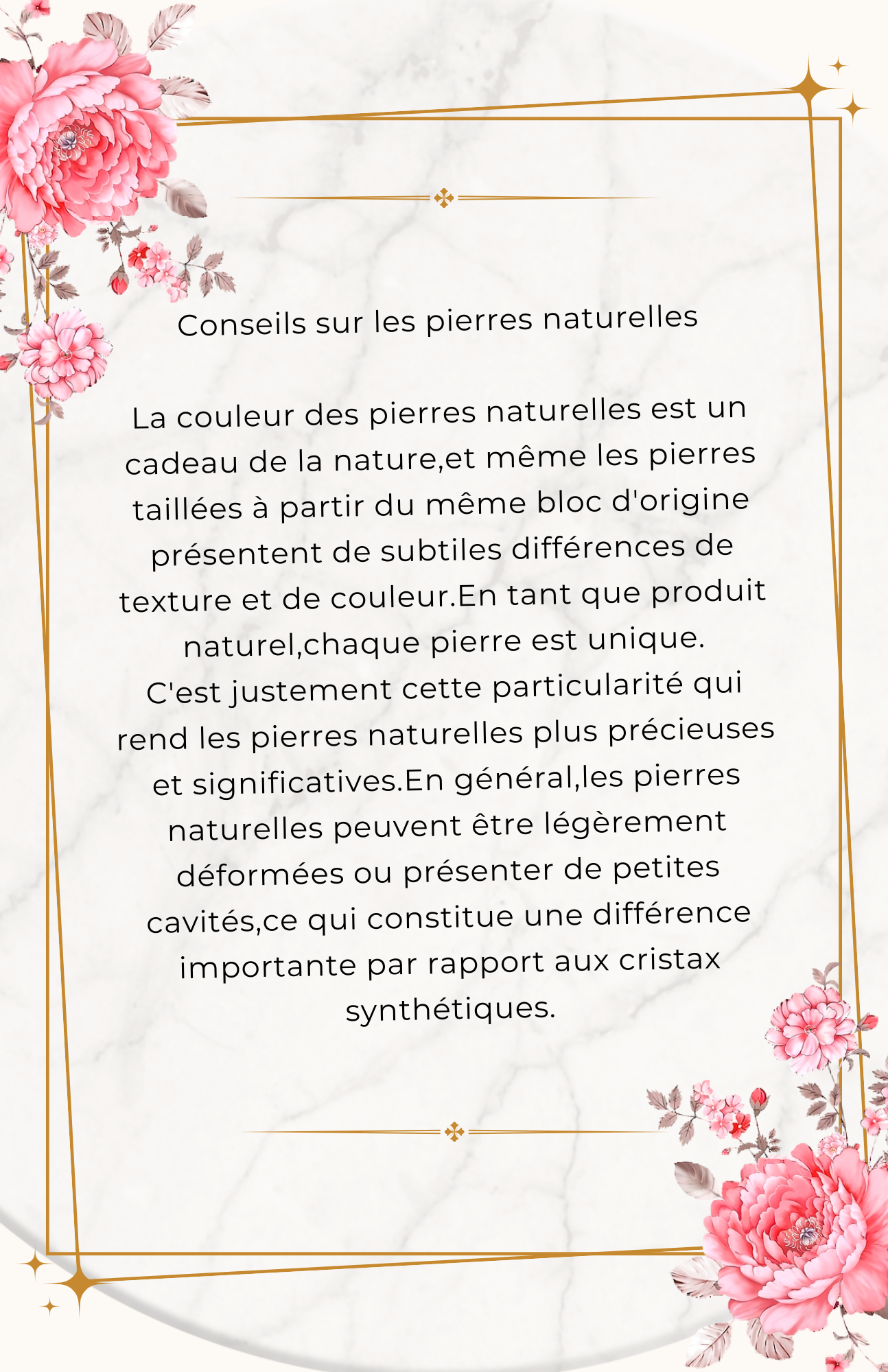 Tous nos bijoux sont créés dans notre atelier uniquement avec des pierres naturelles,pour vous aider à atteindre l'équilibre,le bien-être et l'harmonie dans votre vie,avec des perles Swarovski et cristaux Swarovski pour un look plus raffiné.