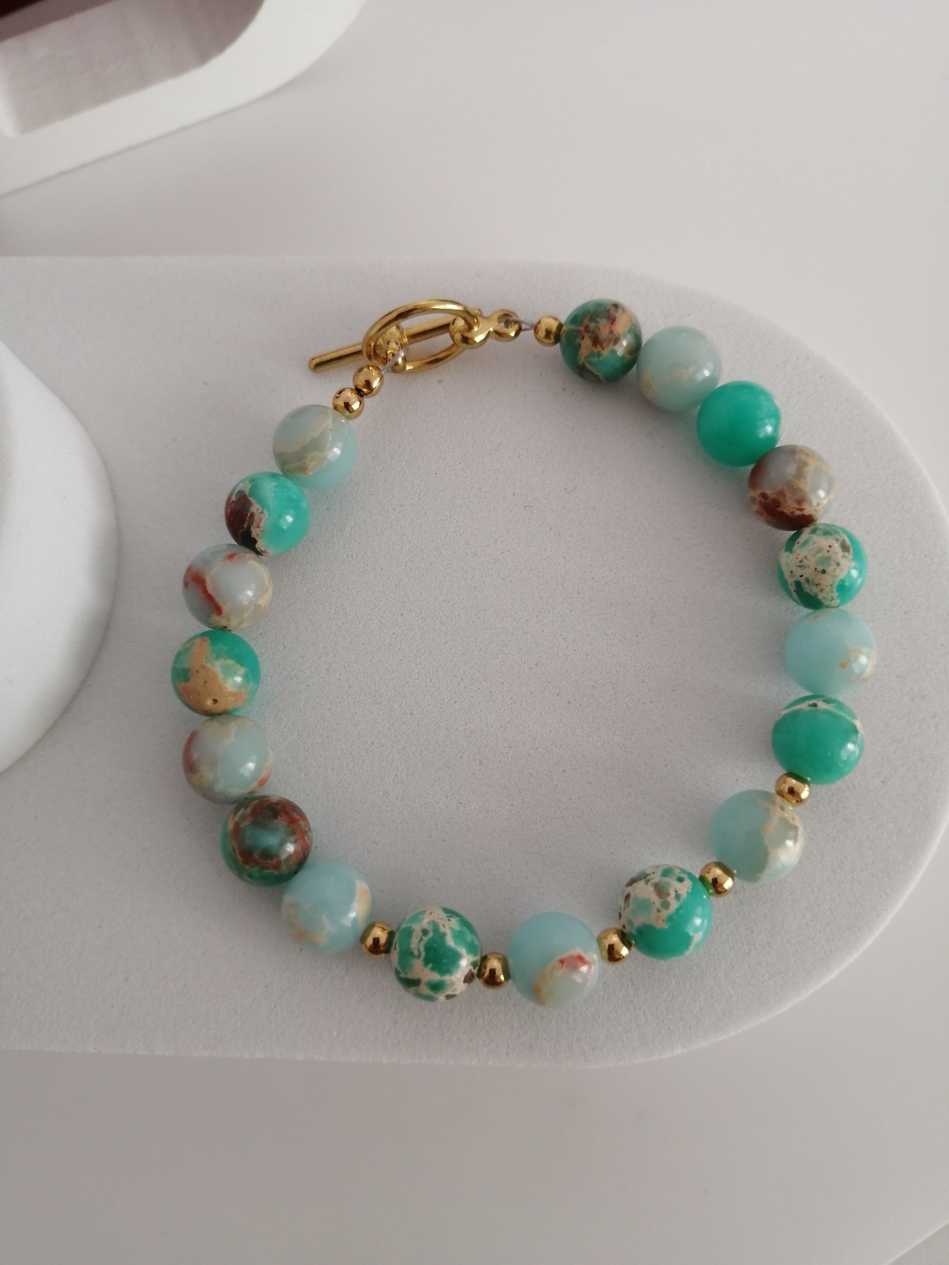 Turquoise Imperial Jasper bracelet with small golden beads.