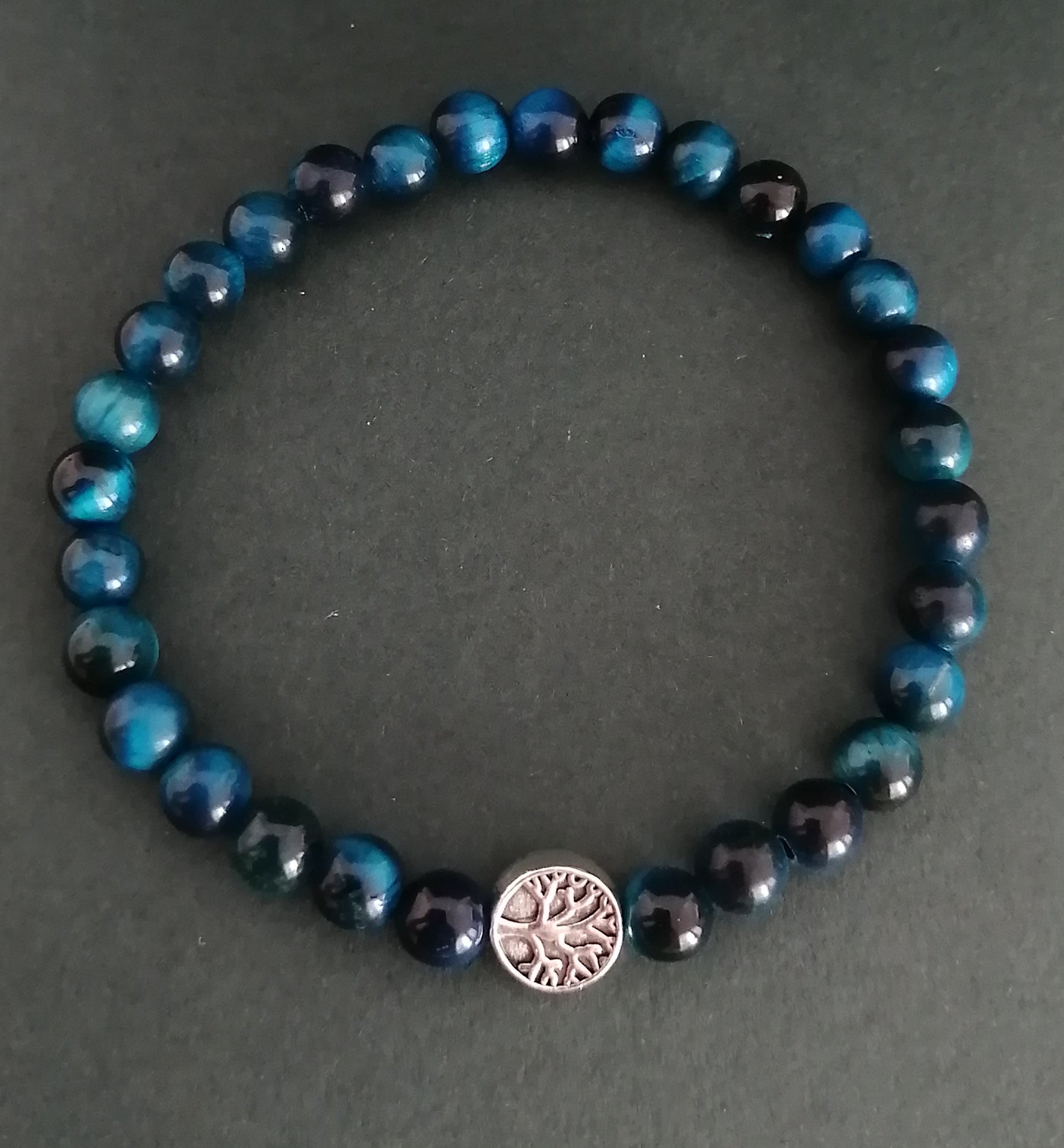 Armband in de vorm van een blauwe tijgeroog met een levensboom als accessoire.