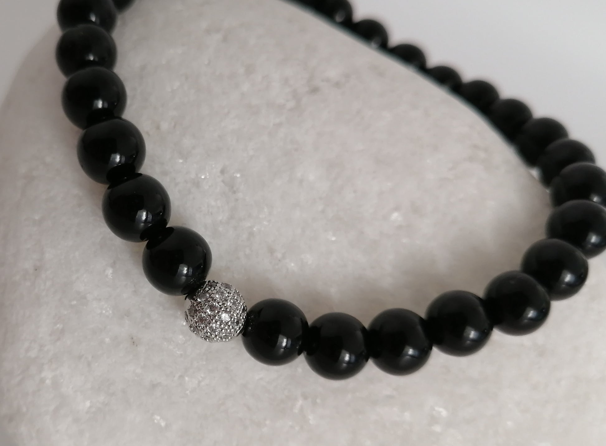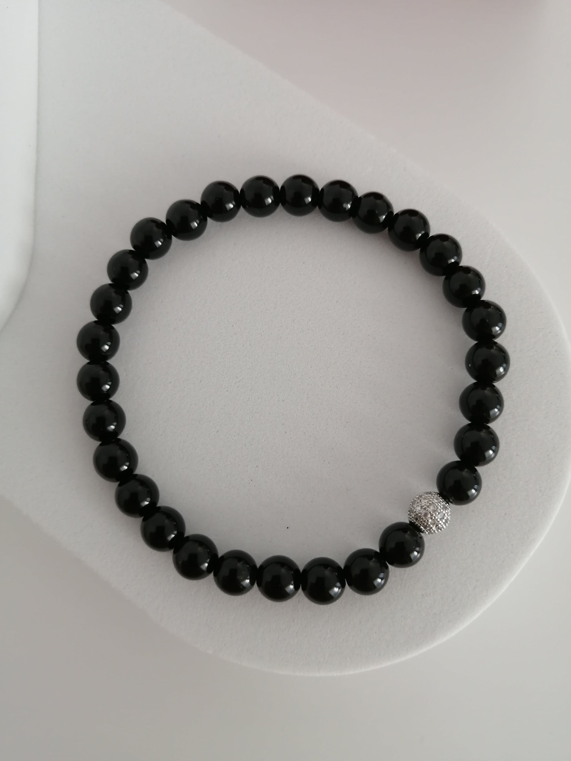 Deze armband, bestaande uit ronde zwarte onyxkralen van 6 mm en een kraal met zirkoniakristallen, biedt bescherming en stabiliteit. Onyx staat bekend als een steen die helpt bij het versterken van zelfvertrouwen, zelfrespect en zelfbeheersing.