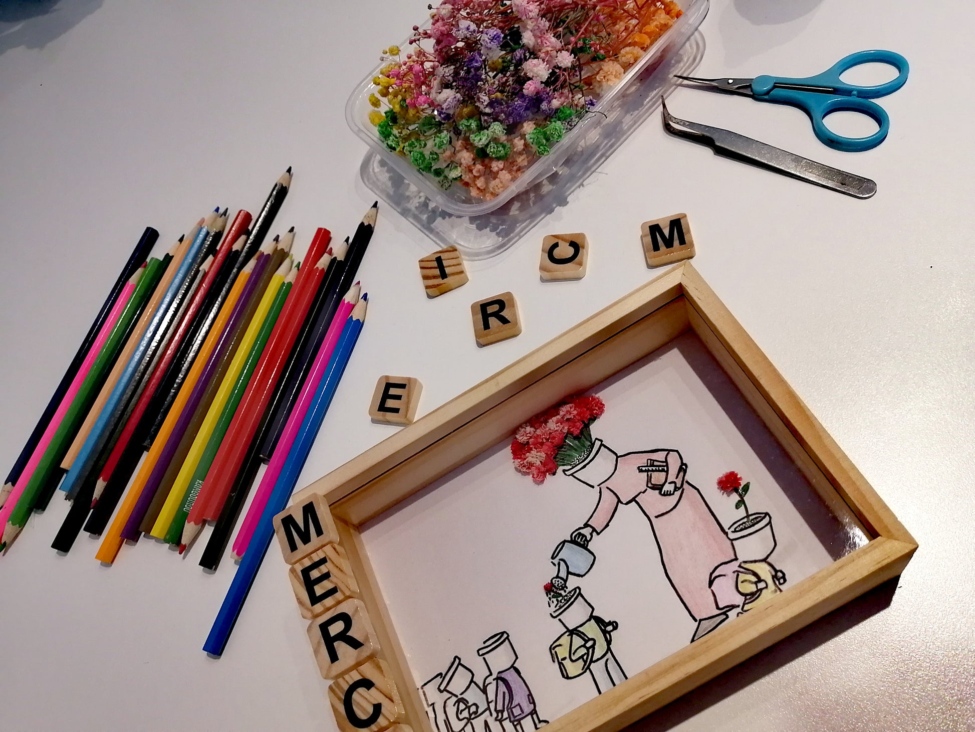 Houten lijst met glas, gedroogde natuurlijke bloemen en houten letters.