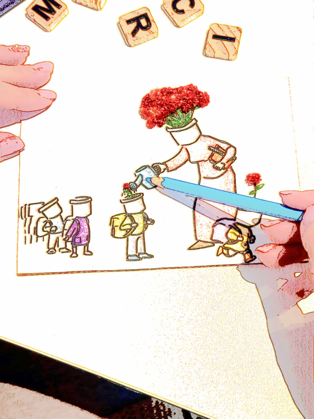 Klein kader met de tekst: DANK U WEL en een mooie afbeelding die de belangrijke rol van leerkrachten in het leven van het kind weerspiegelt.