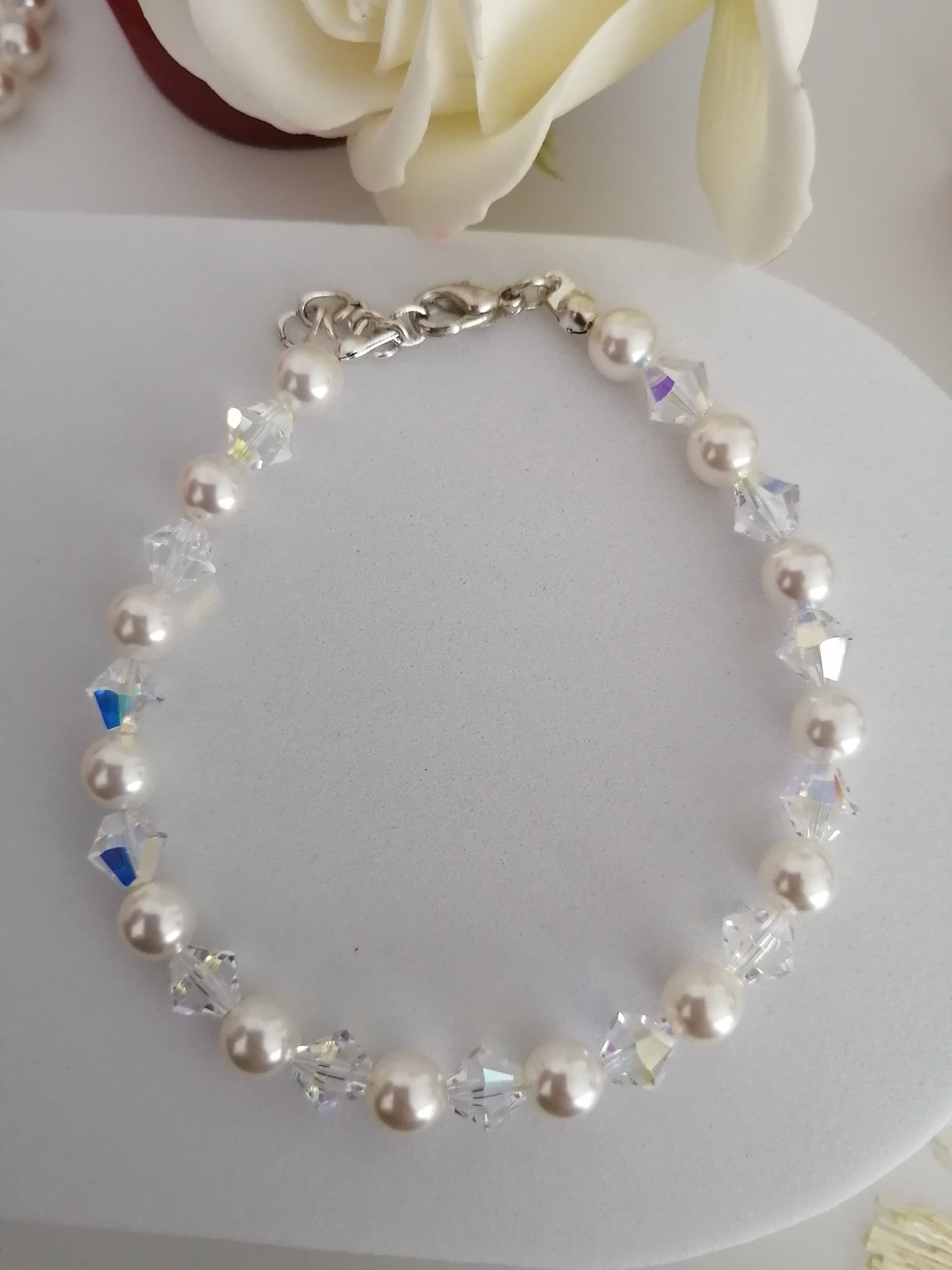 Bracelet en perles rondes Swarovski crystal white de 6mm et cristaux biconiques Swarovski aurores boréales de 6mm.Un bracelet élégant et brillant.