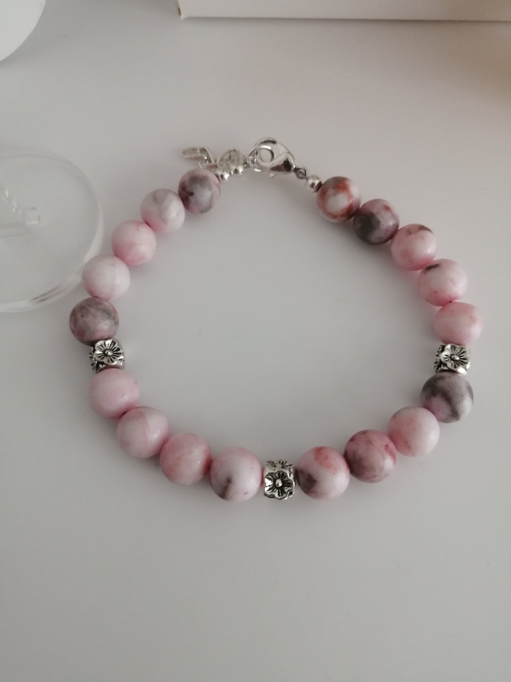 Bracelet en Jaspe Zèbre Rose avec accessoire perle d'espacement petite fleur.