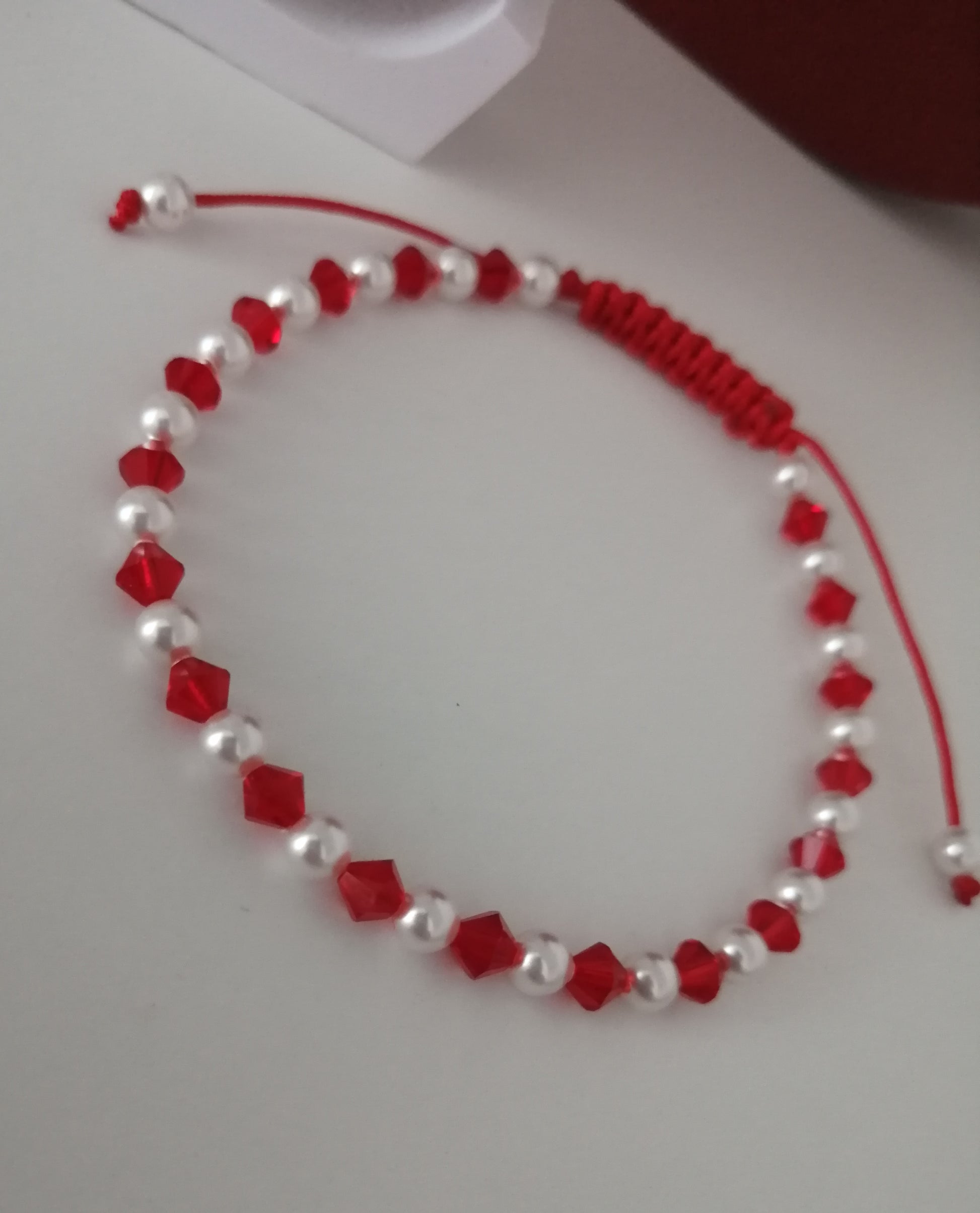 Bracelet en perles Swaroski crystal white de 4mm avec cordon rouge réglable et de cristaux Swarovski rouge light siam.Un bracelet très fin que vous pouvez porter à tout moment.